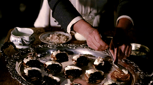 So, I love Babette. She wins the lottery and blows it on a feast to end all feasts. She cooks for them and doesn’t even have the pleasure of dining with them, but you can see that she’s loving every minute preparing it. She treats her guests to an incredibly excessive night of food and drink, which at first, they have no appreciation for. Starting with Blini Demidoff au Caviar (buckwheat cakes with caviar) paired with Veuve Clicquot Champagne and ending with Baba au Rhum avec les Figues (rum infused yeast cake with dried figs) and coffee, we see the hardened diners’ faces melt by the end of the meal – finally seeing life in glorious high-definition colour from a grey existence of black and white.